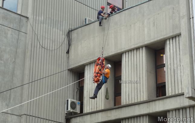 Изключителна атракция за присъстващите бе извеждането на хора от височките части на сградата. Алпинисти се спуснаха от покрива на зданието, а от по-ниските етажи над служебния вход бе свален човек чрез тролеен метод. Кукла влезе в ролята на спасен чрез скок върху надуваема основа.Чучелото полетя от височина около 20 метра.
