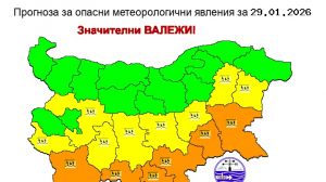 За осем области в страната, сред които и Варна, за четвъртък – 29 януари, е обявен жълт код за обилни валежи. Очакваните количества са между 20 и 35 мм за 24 часа, като е възможен и интензивен валеж до 30 мм за шест часа, става ясно от информация в сайта на Националния институт по метеорология и хидрология (НИМХ).
