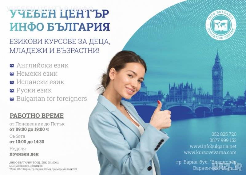 УЧЕБЕН ЦЕНТЪР ИНФО БЪЛГАРИЯ организира целогодишни курсове и уроци по английски език за всички възрасти....
