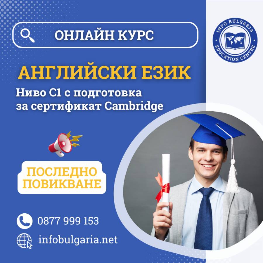 В Учебен център Инфо България започва ОНЛАЙН група за НАПРЕДНАЛИ по английски език, на ниво C1 с подготовка за престижния сертификат Cambridge. Групата...