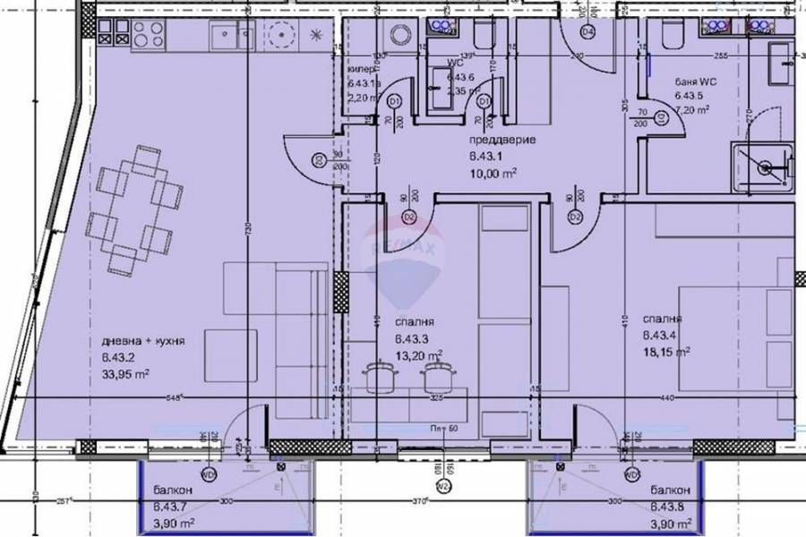 Разположен на дванадесети етаж, апартаментът е с южно изложение. Състоящ се от: Дневна с кухненска част, 33, 95 кв. м., с излаз на тераса; Спалня, 13.2 кв. м.; Спалня, 18, 15 кв. м.; Баня с тоалетна, 7, 2 кв. м.; Баня, 2, 35 кв. м.; Килер, 2, 2 кв. м.; Тераса, 3.9 кв. м.; Тераса, 3.9 кв. м.