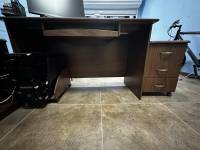 Продавам използвано, но много запазено офис обзавеждане. Комплектът включва: бюро с контейнер за компютър и издърпващ се рафт за клавиатура, 2 бр.комоди с по три чекмеджета, един двоен шкаф, също с по-широки чекмеджета за съхранение, работен стол, 3 посетителски стола, ниска масичка с две табуретки и мултифункционално устройство /копирна машина, принтер, скенер, факс/ Brother MFC 7360N.