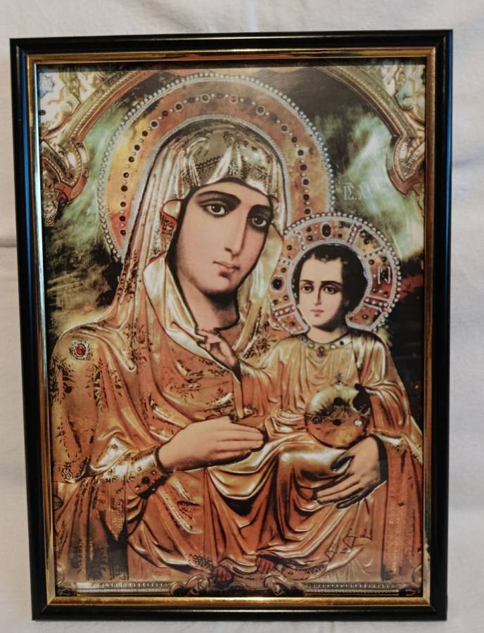 Продавам нова икона на Св. Богородица с Младинеца в рамка с размери: ширина 21.5 см., височина 29.5 см. и стъкло отпред.