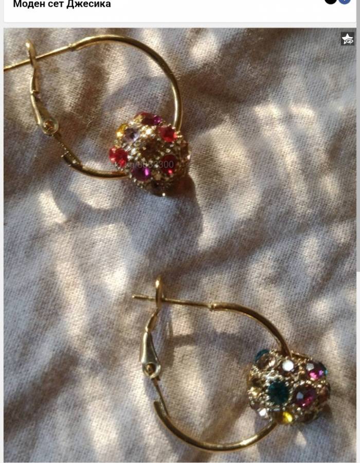 Моден уникален дамски сет състои се от обеци и от ланче с медальон в покритие от жълто злато на метална верижка. Разноцветни кристали.