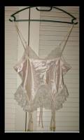 Разкошно марково еротично боди със запазени вшитите етикетчета отвътре, модел с дантели и розетки, с вградени жартиери за дълги чорапи, в цвят: прасковено розово