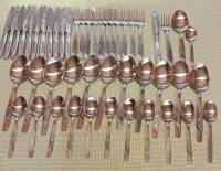 Продавам нов комплект за хранене за 12 души с красиви орнаменти на дръжките от неръждаема стомана. 12 вилици големи, 12 лъжици големи, 12 малки лъжички и 12 ножа/ изострени са допълнително/. Комлекта мислех да го ползвам и за това ножовете са изострени допълнително, но като съм ги прибрала така и съм ги забравила и сега излязоха, но вече ползвам други прибори. Използвана е допълнителна светлина и за това лъжиците така изглеждат.