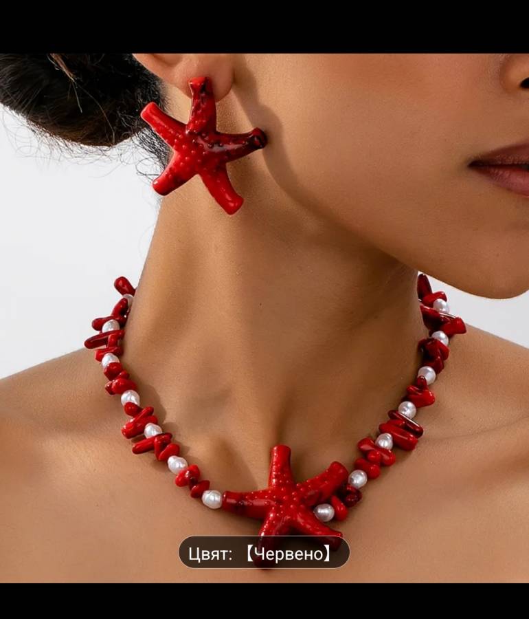 Прекрасен свеж летен сет от 3 броя бижута в наситен коралово червен цвят и в океански стил.