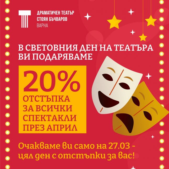 По случай Световния ден на театъра – 27 март, Драматичен театър „Стоян Бъчваров“ във Варна стартира промоционална кампания. Всички билети от априлската програма ще се предлагат с 20% отстъпка и могат да...