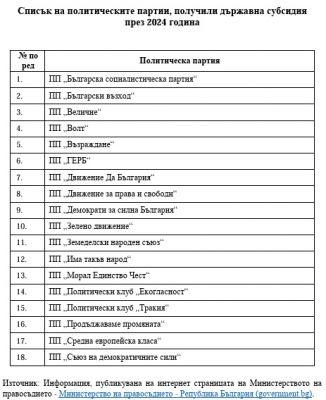 Върховната одитна институция на България публикува списък на политическите партии, чиито годишни финансови отчети за 2024 г. са представени в Сметната палата в законовия срок – 31 март 2025 г. и отговарят на изискванията за форма, съдържание и начин на представяне на отчета съгласно чл. 34 от Закона за политическите партии, списък на политическите партии, непредставили в Сметната палата годишните си финансови отчети за 2024 г. съгласно изискванията на чл. 34 от Закона за политическите партии. Публикуван е и списък на партиите, които са получили държавна субсидия през 2024 година.