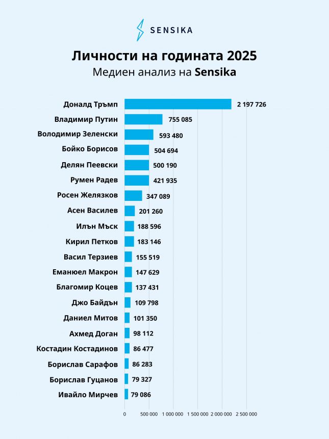 На първо място е Доналд Тръмп, следван от Владимир Путин, Володимир Зеленски, Бойко Борисов и Делян Пеевски, които имат сходни резултати, Румен Радев, Росен Желязков, Асен Василев, Илън Мъск, Кирил Петков, Васил Терзиев, Еманюел Макрон, Благомир Коцев, Джо Байдън, Даниел Митов, Ахмед Доган, Костадин Костадинов, Борислав Сарафов, Борислав Гуцанов, Ивайло Мирчев.