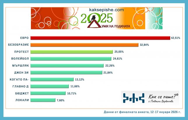 Инициативата за пета поредна година откроява най-важните теми за изминалите 12 месеца през употребата на думите както сред хората, така и в медиите. Във финалната анкета всеки можеше да гласува за три думи и изрази, които са белязали 2025-а, а медийният анализ отново е предоставен от системата за глобален медиен мониторинг Sensika. Неизненадващо думата, която е отбелязана и в двете класации, е „евро“.
