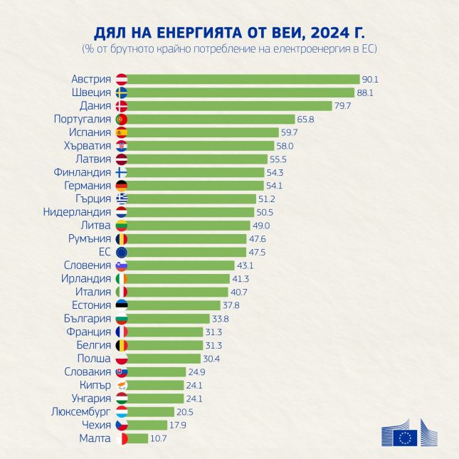 Най-висок е делът на ВЕИ в Австрия – 90,1%, а най-нисък в Малта – 10,7%.