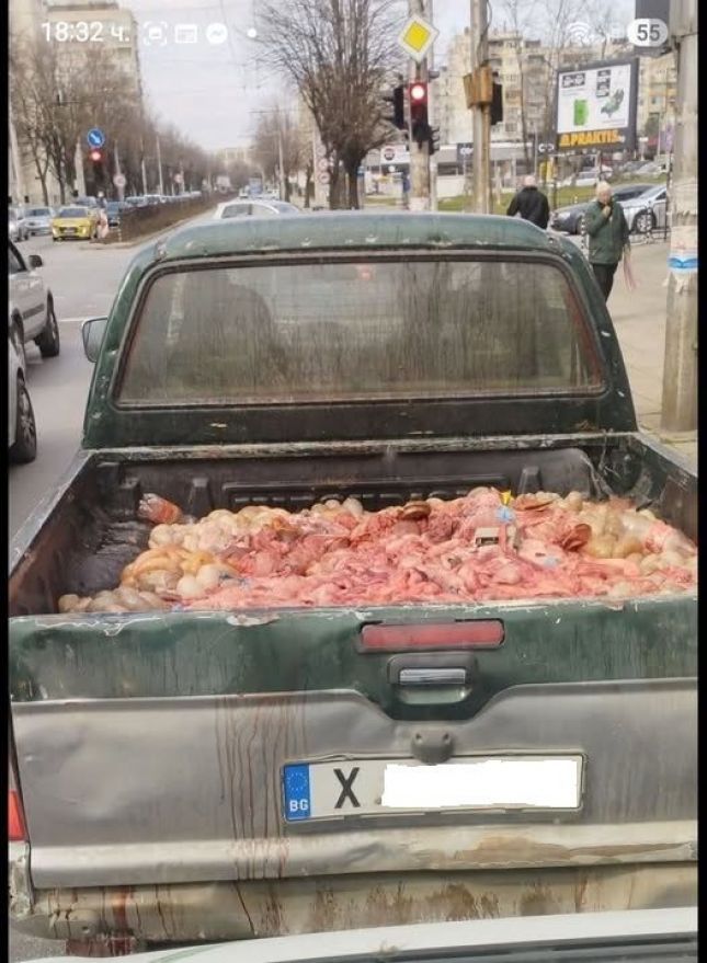 Инспектори от ОДБХ са попаднали на публикация в социалните мрежи, на която се вижда пикап с открита каросерия, натоварен с животински вътрешности. Според описанието към снимките, по време на движение от автомобила е изтичала кръв върху пътното платно.