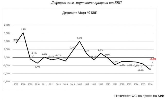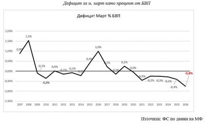 Причина за рязкото нарастване на дефицита са разходите по консолидираната фискална програма (вкл. вноската на Република България в бюджета на ЕС), които към март 2026 г. са в размер на 11,5 млрд. евро. За сравнение, разходите по КФП към март 2025 г. бяха в размер на 9,6 млрд. евро. Нарастване на разходите има основно при социалните и здравноосигурителните плащания, включително разходите за пенсии, както и при разходите за персонал, капиталовите разходи и други. Нарастването на разходите за персонал и пенсиите се дължи на индексации, които влизат в сила през месец март. Капиталовите разходи също отчитат значителен ръст, основно поради по-високите разходи във финалния етап на изпълнение на инвестициите по Националния план за възстановяване и устойчивост.
