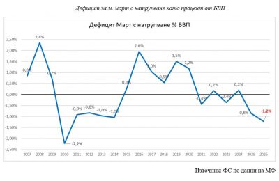 Дефицитът за месец март с натрупване е в размер на -1,5 млрд. евро и представлява -1,2% от БВП – най-високата стойност за последните 15 години (от 2010 г. насам).