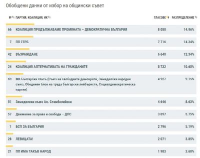 Към момента най-голяма подкрепа получават кандидатите за общински съветници на коалиция "Продължаваме промяната - Демократична България" - 14,96%.