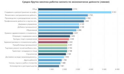 Най-голямо повишение на заплатите е регистрирано в „Образование“ (+21,2%), „Държавно управление“ (+17,9%) и „Добивна промишленост“ (+8,5%).