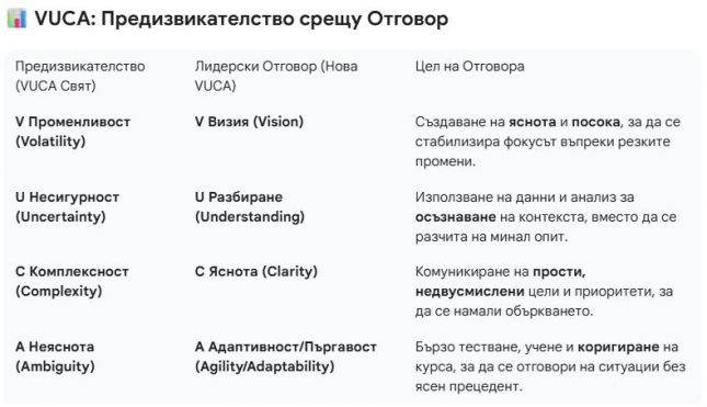 В заключение, лидерството във VUCA света изисква смяна на парадигмата – от устойчивост и предсказуемост към гъвкавост, бързо учене и силно делегиране.
