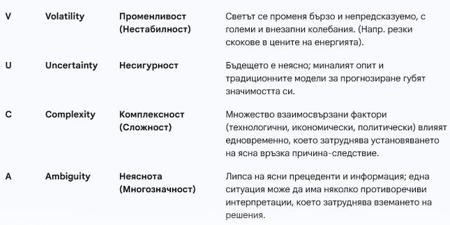 В съвременната бизнес среда, мениджърите и предприемачите са изправени пред предизвикателства, които коренно се различават от тези преди десетилетие. Глобализацията, технологичният напредък и геополитическите промени създадоха условия, които експертите обобщават с акронима VUCA.