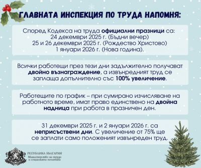 Главната инспекция по труда напомня на работодатели и служители за правилата за труд и заплащане по време на официалните празници в края на годината.