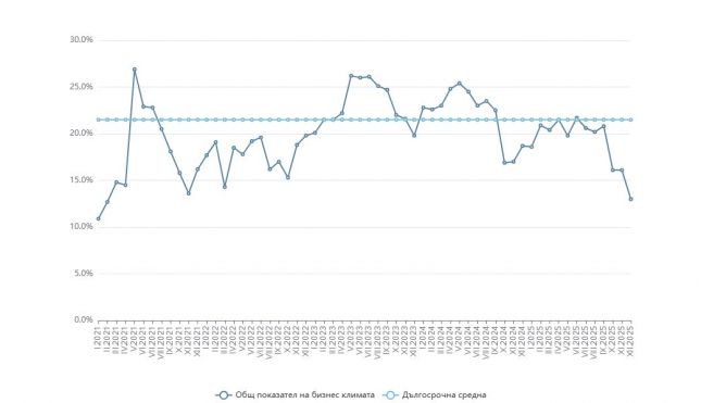 През декември 2025 г. общият показател на бизнес климата в страната се понижава с 3.1 пункта спрямо ноември, от 16.1% на 13.0%, като спад е отчетен във всички наблюдавани сектори – промишленост, строителство, търговия на дребно и услуги, показват данни на НСИ.