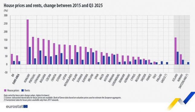 На национално ниво, при сравнение на третото тримесечие на 2025 г. с 2015 г., цените на жилищата са се увеличили повече от наемите в 25 държави членки, за които има налични данни. Най-драстичен е ръстът в Унгария, където цените са се утроили (+275%). В още 11 страни те са се удвоили, като сред тях са Португалия (+169%), Литва (+162%) и България (+156%). Финландия е единствената държава в ЕС, в която цените на жилищата бележат спад за този период – с 2%.