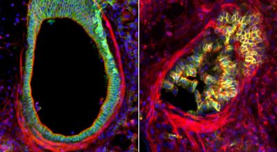 Тези изображения показват как астматичният пристъп може да засегне дихателните пътища. В лявото изображение епителна тъкан на мишка (зеленикаво-жълта), покриваща белия дроб, е напълно отворена, но колабира (вдясно), след като бъде лекувана с лекарство, за което е известно, че стеснява дихателните пътища. Свиването може да доведе до изхвърляне на епителните клетки на тъканта, показват нови изследвания.