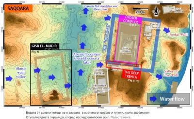 Анализирайки наличните данни, включително палеоклиматологията, изследването на древния климат и археологическите данни, изследователският екип предполага, че водата от древни потоци е текла от западната част на платото Saqqâra в система от дълбоководни ровове и тунели, които заобикалят Стъпаловидната пирамида.
