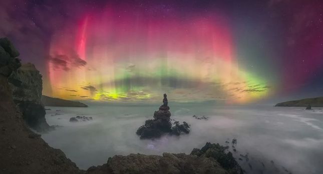 „Това спиращо дъха панорамно изображение, направено по време на интензивна буря G5, улавя жизненото Aurora Australis, пронизващо облаците над назъбена брегова линия. Силата му се крие в баланса между техническа прецизност и емоционален резонанс. Скалистата брегова линия закотвя сцената, контрастирайки с ефирното сияние на полярното сияние. Експертизата на фотографа е ясна в безпроблемното съчетаване на панорамата и изисканата обработка на небето. Направено след часове усилия, изображението предава както естествената красота на полярното сияние, така и всеотдайността на фотографа. Поздравления за фотографа за забележителното постижение.“