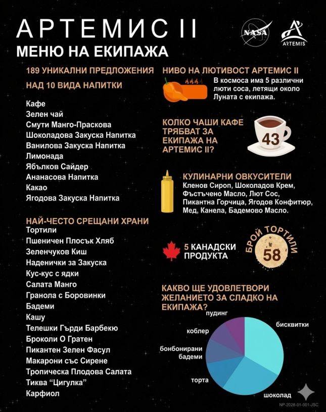 Artemis II пое на мисията си до Луната. Следващите десетина дни в космоса ще прекарат четирима астронавти. За поддържането на здравето и ефективността на екипажа ключова рола има храната. Без възможност за повторно снабдяване, охлаждане или късно зареждане, всички ястия трябва да бъдат внимателно подбрани, за да останат безопасни, стабилни и лесни за приготвяне и консумация в космическия кораб Orion на НАСА. Изборът на храна се разработва в координация с експертите по космически храни и екипажа, за да се балансират нуждите от калории, хидратация и прием на хранителни вещества, като същевременно се съобразяват с индивидуалните предпочитания на екипажа, споделят в своя публикация от Национална администрация по въздухоплаване и изследване на космическото пространство.