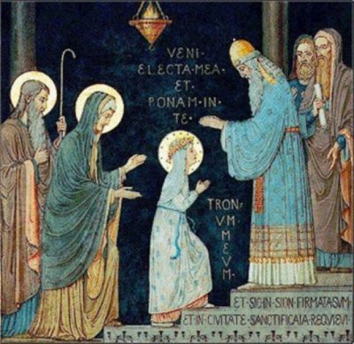 Именно на тази дата, 21 ноември, Йоаким и Ана спазват обета, който са дали преди раждането й – да я обрекат на вярата. Тримата отиват в Йерусалим в храма и я представят на първосвещеника. Тригодишната Мария изкачва високите стълби на храма съвсем сама и се поклонява на свещеника, който я въвежда в храма. Тя остава там до възрастта си за женене, като изучава Светото писание, тъче и преде, отдава се на молитви и служба на Бога. Дори и като навършва определени години, когато е редно да се сгоди, тя обявява решението си да продължи да служи. Тогава свещениците я сгодяват за много по-възрастния благочестив Йосиф, който уважава обета й към Бога и не поддържа с нея съпружески отношения. Младата Мария остава символ на чистата служба на Бог и е удостоена с честта да зачене непорочно Сина Му.