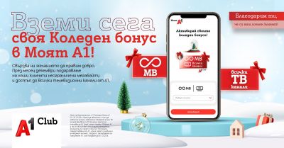 Неограничени мегабайти на максимална скорост за частните абонати с мобилна услуга и достъп до всички ТВ канали за клиентите на фиксирана телевизия дава телеком операторът до края на декември. Подаръците от А1 са част от коледната кампания „Свързва ни доброто“, която набира средства за по-добро детско здравеопазване през Моят А1.