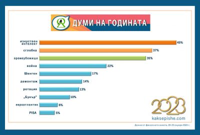 Словосъчетанието победител „изкуствен интелект“ ни свързва с глобалните тенденции. Употребата му се е повишила почти 5 пъти в сравнение с 2022-ра, отбелязват организаторите на инициативата – д-р Павлина Върбанова, създателка на „Как се пише?“, и Доротея Николова, учителка по български език и литература и журналистка.
