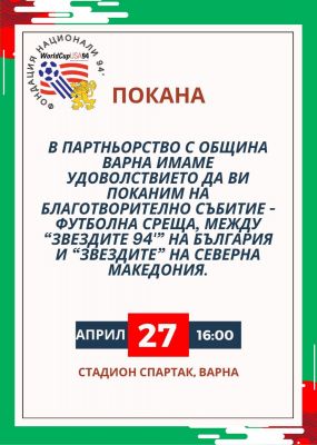 Благотворителният мач с участието на легендите от САЩ’94 ще се играе на 27 април, неделя, от 16 часа на стадион "Спартак" във Варна, научи Moreto.net.