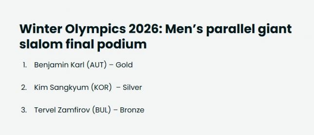 Тервел Замфиров донесе първия олимпийски медал за България на игрите в Милано–Кортина, след като спечели бронз в паралелния гигантски слалом на алпийския сноуборд. В битката за третото място българинът надделя над словенеца Тим Мастняк след фотофиниш.