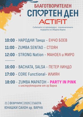Събитието ще се проведе на 21 февруари, събота, от 09:00 ч. до 20:00 ч. в Юнашкия салон. Организаторите са подготвили разнообразна програма от спортни активности, която ще завърши със Zumba маратон. Тренировките ще бъдат водени от инструктори по групови занимания от Варна, като в тях могат да се включат желаещи от всички възрасти. Входът за „Благотворителен спортен ден“ е свободен.