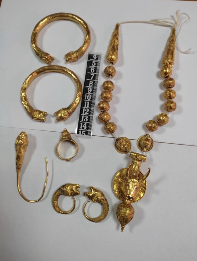 При процесуално-следствените действия на 14 адреса са иззети над 500 предмета, носещи белези на културни ценности, сред които: тракийски шлем; антични златни накити от 4-3 век пр.н.е. - 7 части с общо тегло около 400 грама, 22 карата; античен шлем с произход Източна Азия приблизително от 2-ри век пр.н.е. и 2 антични златни обици.