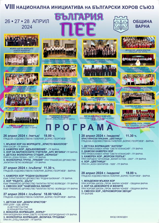 18 хорови формации от Варна и един гостуващ хор от Балчик ще изнесат концерти в морската столица. Включвайки се в VIII Национална инициатива „България пее“ на Българския хоров съюз, Община Варна организира на 26, 27 и 28 април поредица от концерти в Градската художествена галерия „Борис Георгиев“.