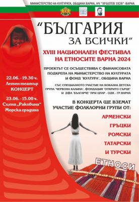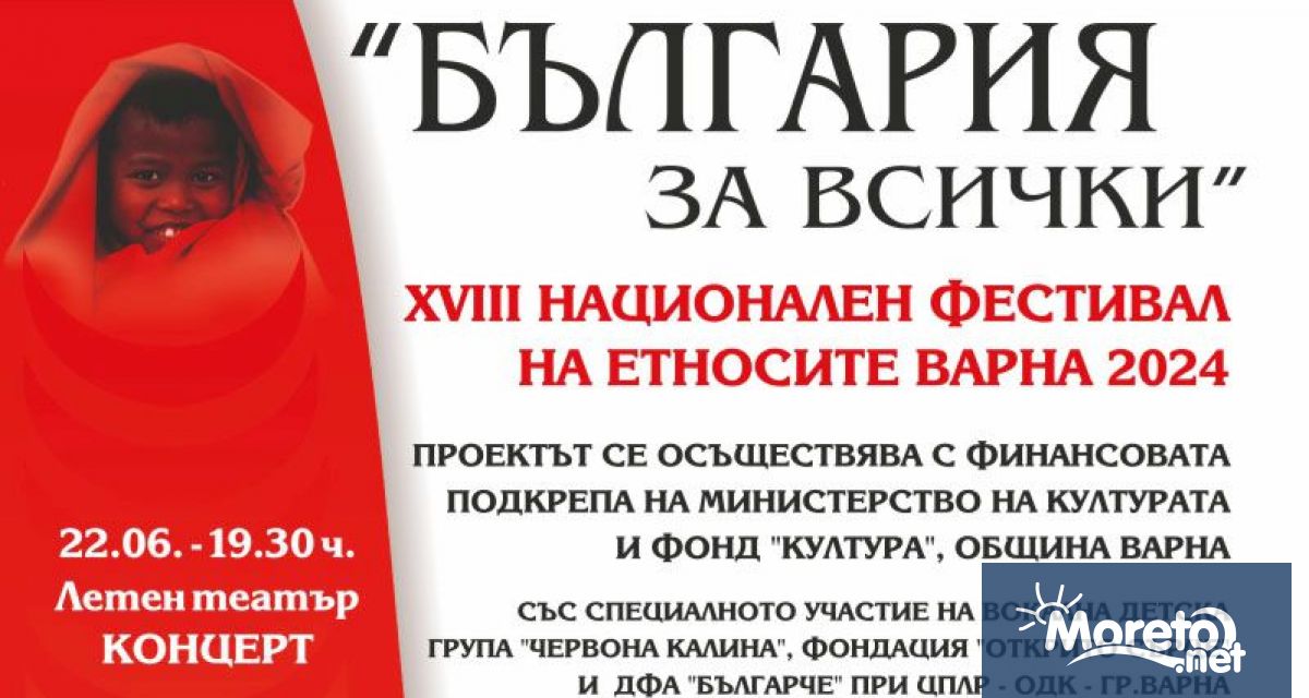 Национален фестивал на етносите "България за всички" ще се проведе днес и утре (22-23 юни) във Варна, припомня Moreto.net