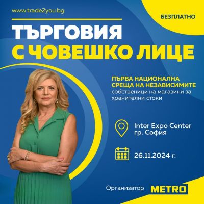 На 26 ноември в зала „Витоша“ на Интер Експо Център в столицата предстои Първата среща на независимите собственици на магазини за хранителни стоки под мотото „Търговия с човешко лице“. Поканени са представители на традиционната търговия от цяла България, които могат да участват безплатно след регистрация на уебсайта на събитието trade2you.bg. Те ще обменят опит по основните предизвикателства в своя бизнес и за това как да бъдат по-конкурентоспособни в условията на пазара на бързооборотни стоки.