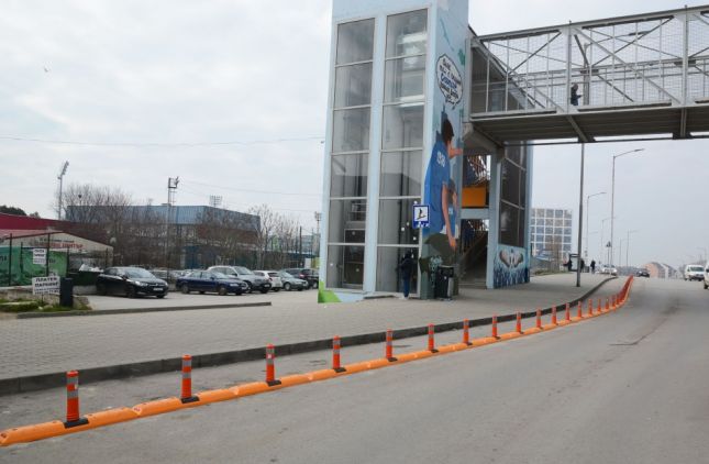 Пътните ограничители са поставени от автобусната спирка пред стадиона до входа на близкия търговски комплекс.