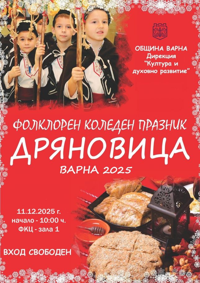 В навечерието на Рождество Христово над 500 изпълнители ще се включат в традиционния общоградски фолклорен празник „Дряновица“. Събитието ще се проведе на 11 декември от 10:00 ч. във Фестивалния и конгресен център – Варна. Входът е свободен.