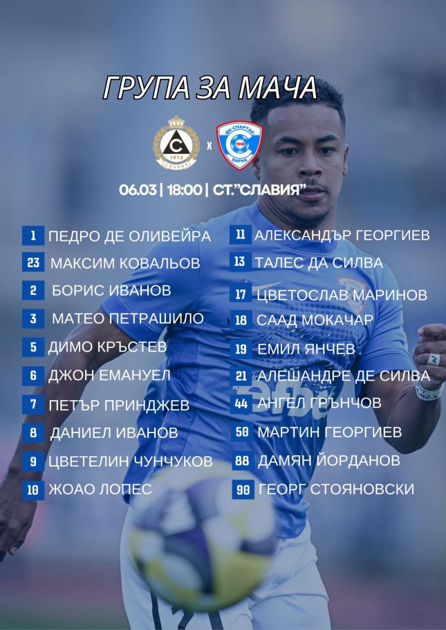 1. Педро де Оливейра, 23. Максим Ковальов, 2. Борис Иванов, 3. Матео Петрашило, 5. Димо Кръстев, 6. Джон Емануел, 7. Петър Принджев, 8. Даниел Иванов, 9. Цветелин Чунчуков, 10. Жота Лопеш, 11. Александър Георгиев, 13. Талес, 17. Цветослав Маринов, 18. Саад Мокачар, 19. Емил Янчев, 21. Шанде, 44. Ангел Грънчов, 50. Мартин Георгиев, 88. Дамян Йорданов, 90. Георг Стояновски