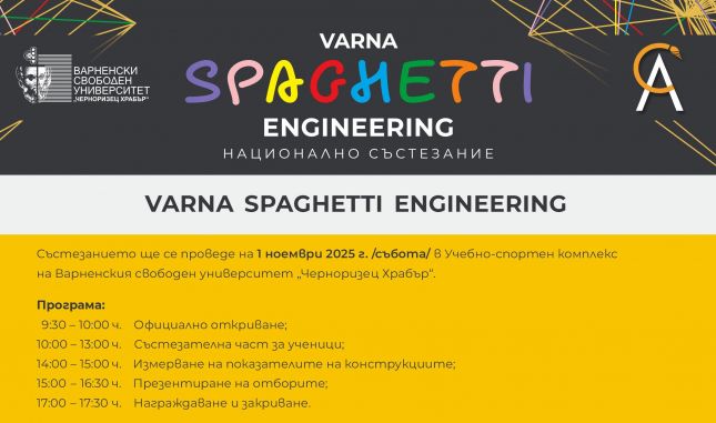 | | Млади инженери мерят креативност във „Varna Spaghetti Engineering“ на 1 ноемвриЗадачата: плоска покривна конструкция на една опора На 1 ноември – Деня на народните будители, в Учебно-спортния комплекс на Варненския свободен университет „Черноризец Храбър“ ще се проведе единадесетото издание на националното състезание за креативни умения „Varna Spaghetti Engineering“.