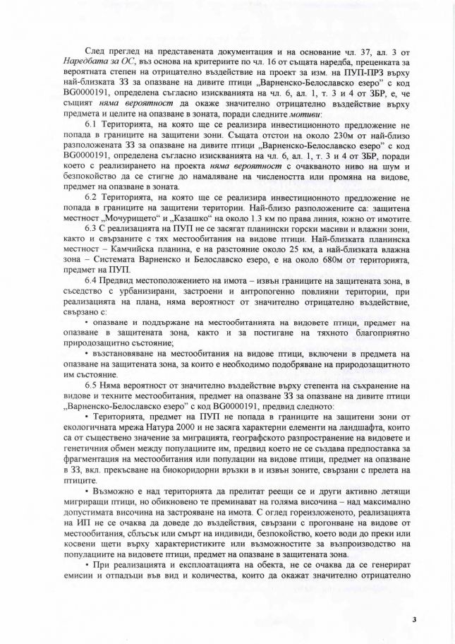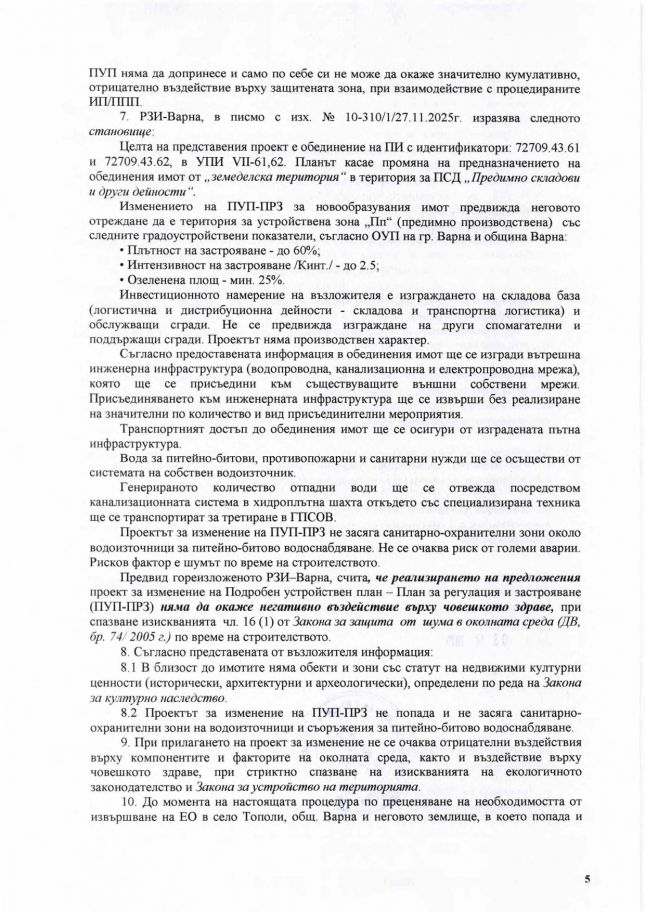 Контролният орган РИОСВ Варна е провел процедура по преценяване на необходимостта от извършване на екологична оценка на ПУП за „Изграждане на производствено складова база“, находяща се в ПИ №72709.43.61 и ПИ №72709.43.62 по КККР на с Тополи, община Варна, област Варна. с които се предвижда обединяване на ПИ и промяна на предназначението на новия имот - За производствени, складови и административни дейности и е постановил Решение № ВА-104/ЕО/2025 със заключение „ДА НЕ СЕ ИЗВЪРШВА ЕО“, достъпно за информация при инвеститора на посочения адрес - гр. София, р-н Младост, бул. „Цариградско шосе“, 141, вх. А, ет. 2 и на следния линк: https://riosv-varna.bg/Prevantivna%20dejnost/pr%20EO/2025/104-.pdf .