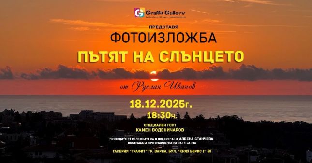 В навечерието на светлите коледни празници галерия “Графит” в гр. Варна ще ни стопли с най-красивата светлина - тази на изгряващото слънце. В 45 художествени фотографии ще бъдат показани магически изгреви над морето край Варна. Уникалното е, че всички те са заснети само от една-единствена точка. Подбрани са от стотици фотоси, снимани в продължение на години.