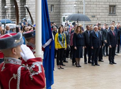 По-късно, пред сградата на президентската институция, Румен Радев и Илияна Йотова присъстваха на тържествената церемония по издигане на знамето на Европейския съюз по случай Деня на Европа. Държавният глава прие почетния караул на Националната гвардейска част.