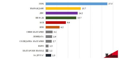 "Медиана": ГЕРБ води сериозно, "Възраждане" са втори, ПП-ДБ изпадат до четвърта позиция