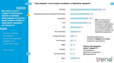 "Не отчитаме сериозна динамика между подкрепата за партиите на парламентарните избори и тези за Европейски парламент. Въпреки това, поради пренебрежителната дистанция между втория, третия и четвъртия, не можем да изключваме различна подредба при вота за Народно събрание и този за Европейски парламент Очаква се малко по-силен резултат на ПП-ДБ за Европейските избори, а БСП ще се представи с близо половин процент по-слабо на тях.", коментират от Тренд.