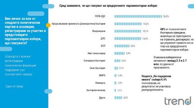 Шест сигурни формации в следващото Народно събрание. ГЕРБ остава лидер с двуцифрена преднина. Без яснота за второто, третото и четвъртото място, показват данни на Тренд.